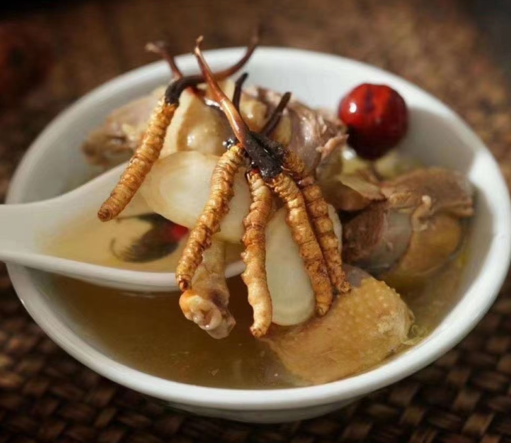 制法: 將雞把毛和內(nèi)臟去掉洗干凈后,放入鍋中,加水燒沸后去掉鍋面上的浮沫,放入冬蟲夏草,用文火燉至雞肉爛熟即可。